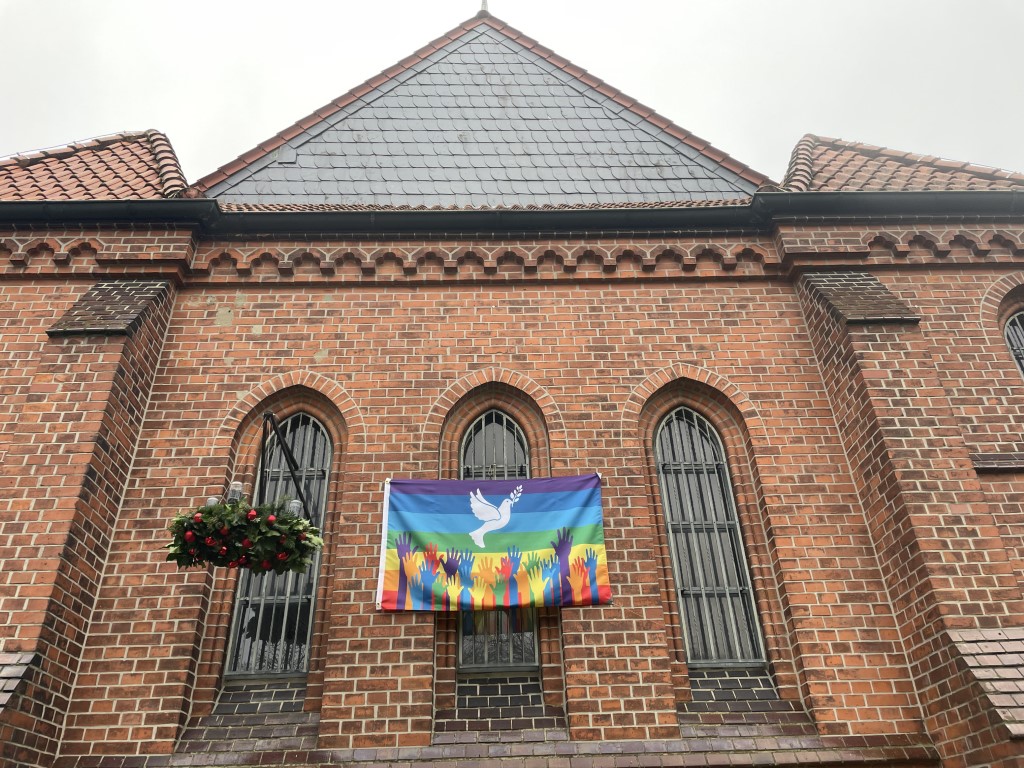 Vielleicht haben Sie es schon bemerkt: An der Außenwand der Neuen Kirche hängt seit Beginn der Adventszeit eine Friedensfahne.